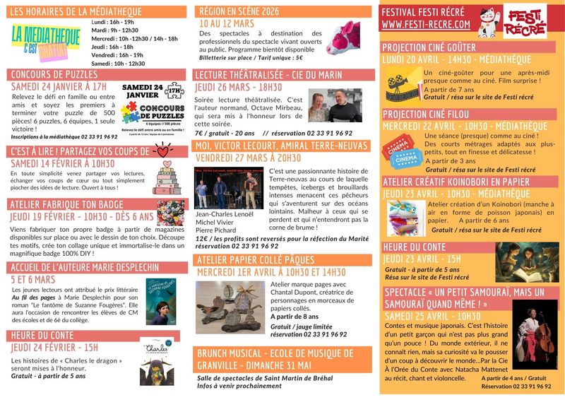 Actualité L'agenda culturel de janvier à juin 2026 Partager cette page POUR ACHETER VOS BILLETS DE SPECTACLE, C'EST ICI : Stationnement des tracteurs sur l'estran Renouvellement de demande pour l'année 2026 Le stationnement des tracteurs avec remorques utilisées pour la mise à... Saison culturelle 2025/2026 Une saison culturelle à vol d’oiseau #2 BIENVENUE DANS LA SAISON 2025-2026 Le réseau Voisins d’Scènes est né sous... Du 22 septembre 2025 au 24 octobre 2025 Enquête publique PLUi La Communauté de communes organise une enquête publique sur le Plan local d’urbanisme intercommunal, du lundi 22... Retour aux actualités